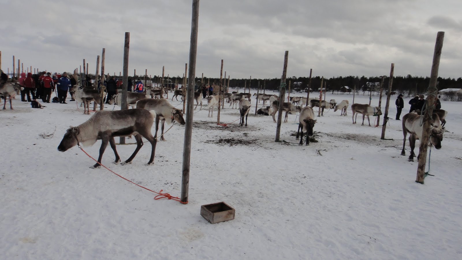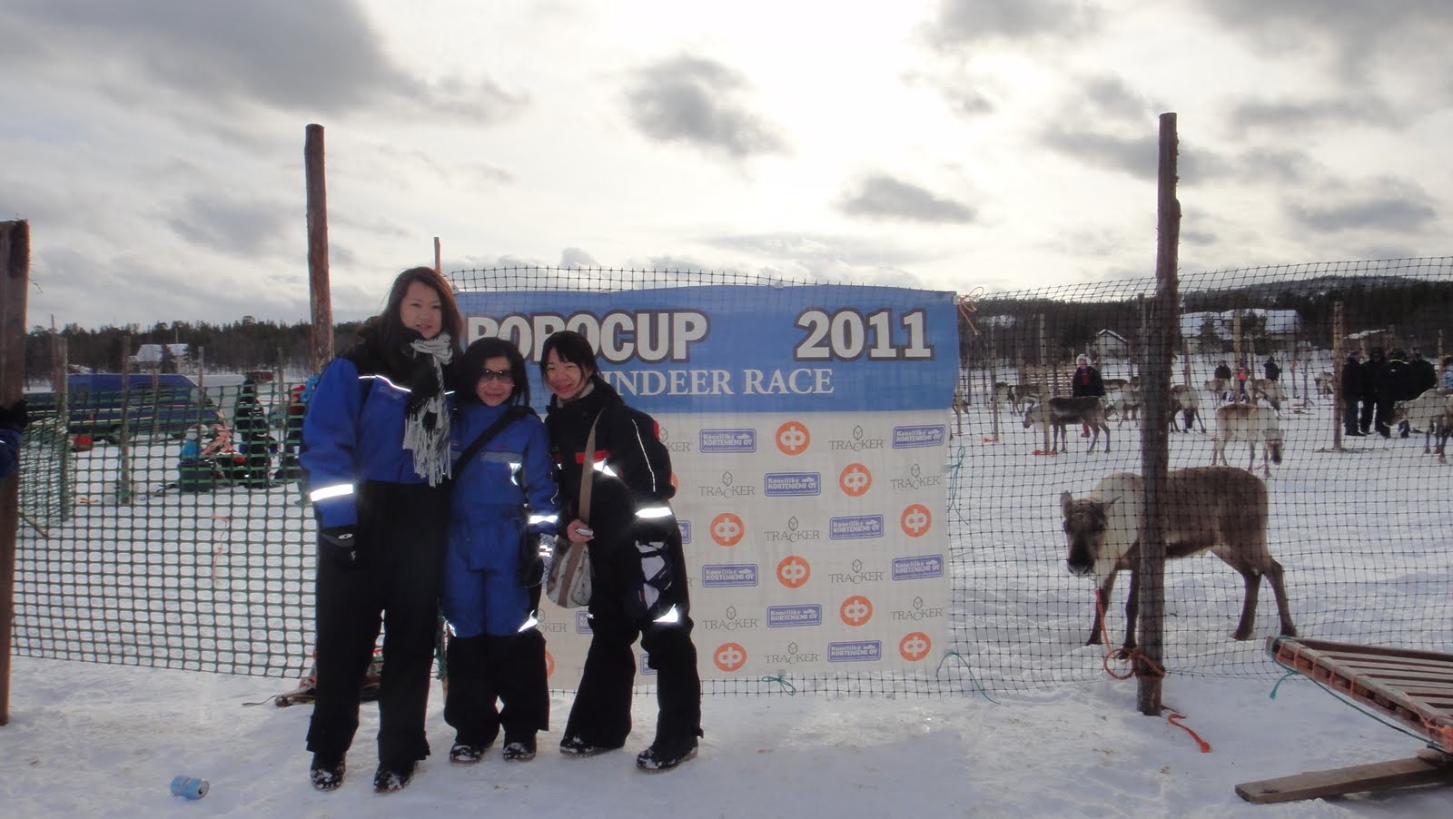終於在騎了兩個小時橫越Inari湖之後,我們來到Inari了。一到馬上就看到很多可愛的麋鹿,只是因為他們是比賽用的,所以頭上的角都被鋸掉了。