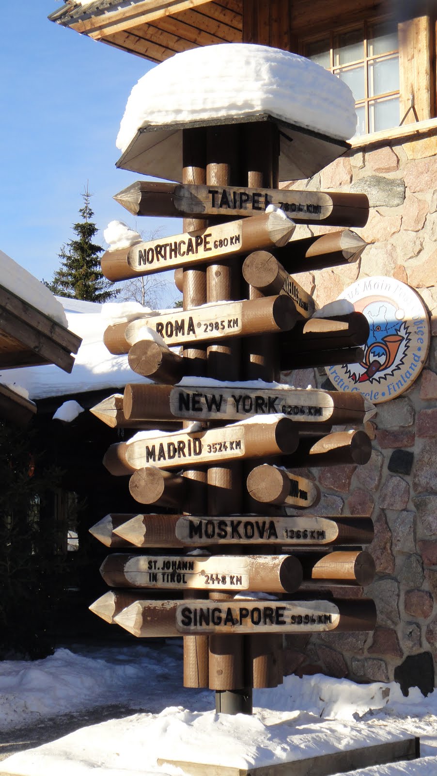 請看最上頭的是哪個城市? 沒錯!是台北!!哇~在北極圈的聖誕老人村看到台北的標誌,台北跟我現在的地方有7800公里的距離。