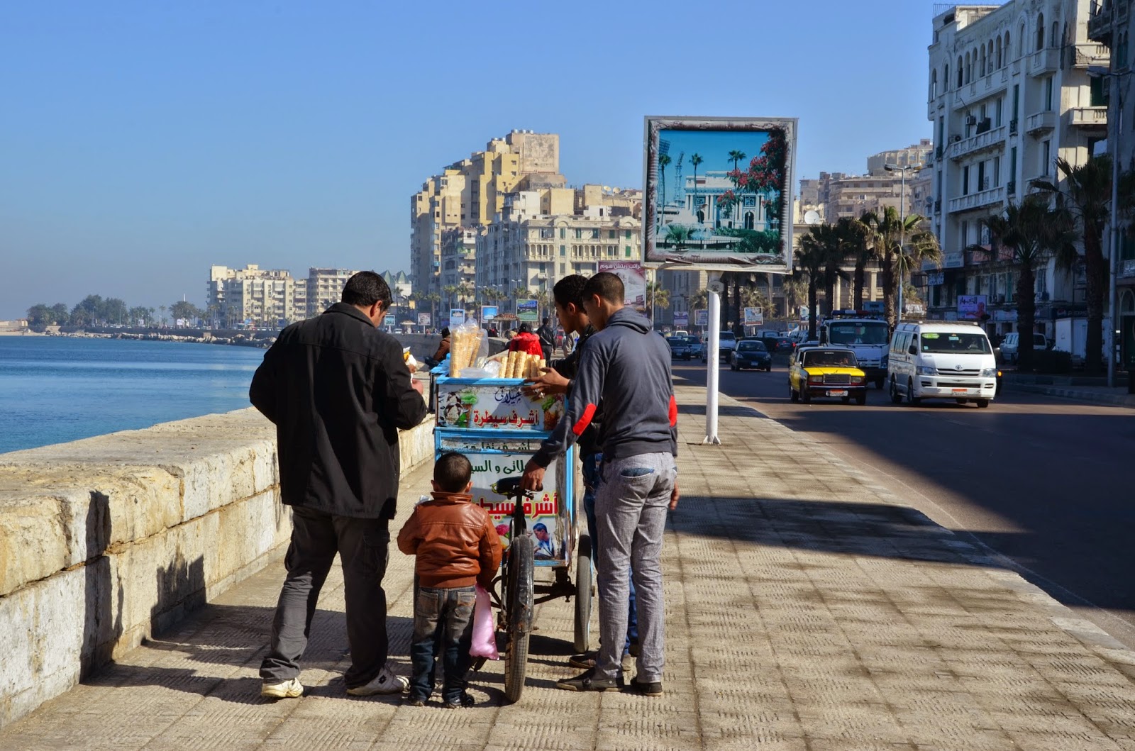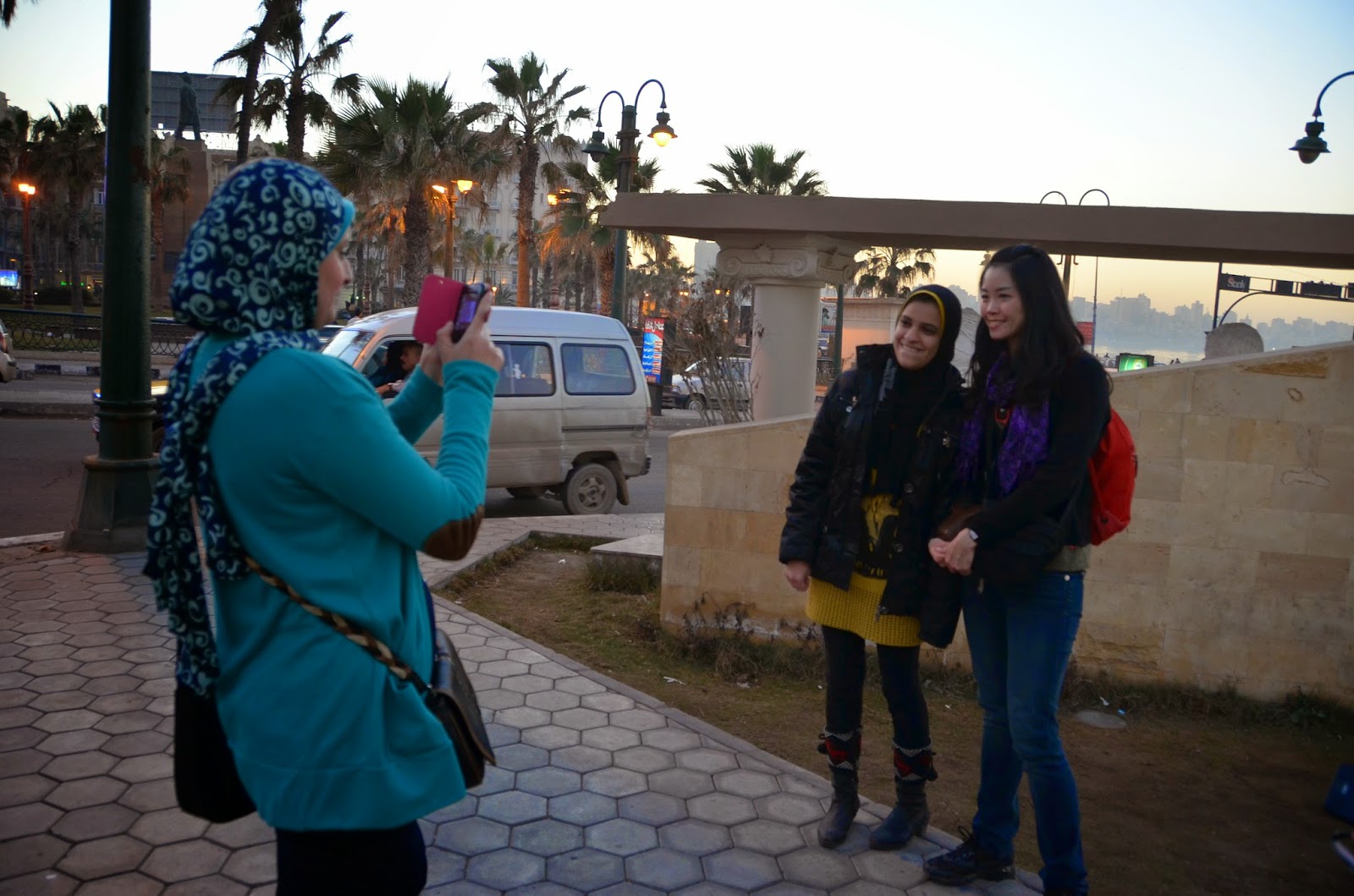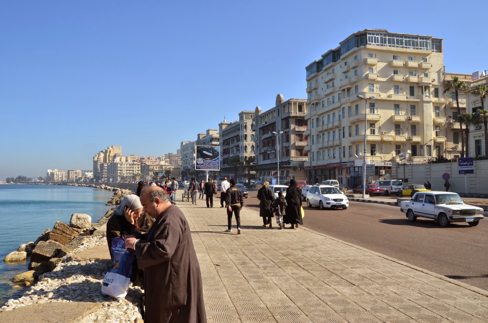 相信去過的人都知道開羅可怕的交通,雖說這是埃及第二大城,但沒有開羅的忙碌與擁擠。沿著地中海走,還會有很多媽媽爸爸帶著小孩在那坐著看海或是聊天。幾個好朋友也是坐在那嘰嘰喳喳的聊天,看到我們三個外國人,害羞(?)的咯咯笑。