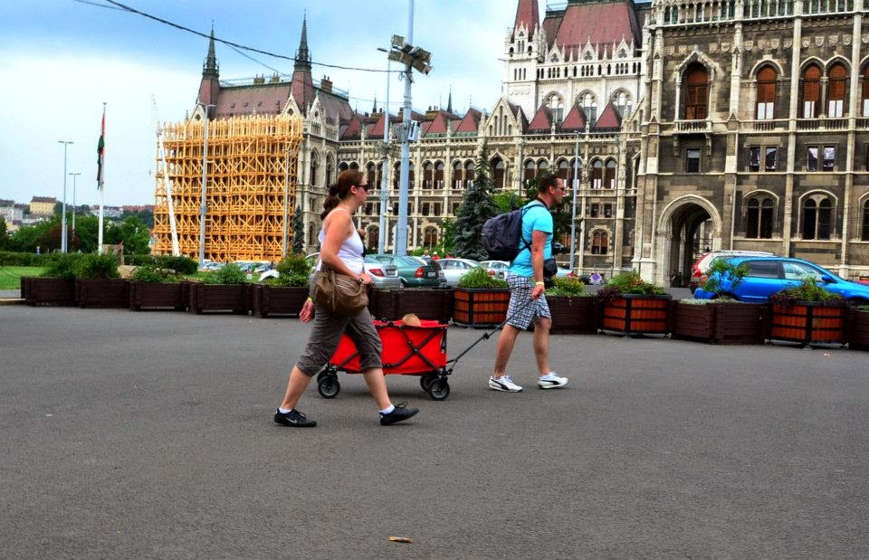 發現歐洲人常常有很特別的idea,例如這對夫妻,就這樣把他們的小孩裝進推車裡這樣拉著走,其實發現,這樣也很棒呀,小孩可以在自己的小小空間裡玩玩具,又可以跟爸媽到處晃,真聰明呀。