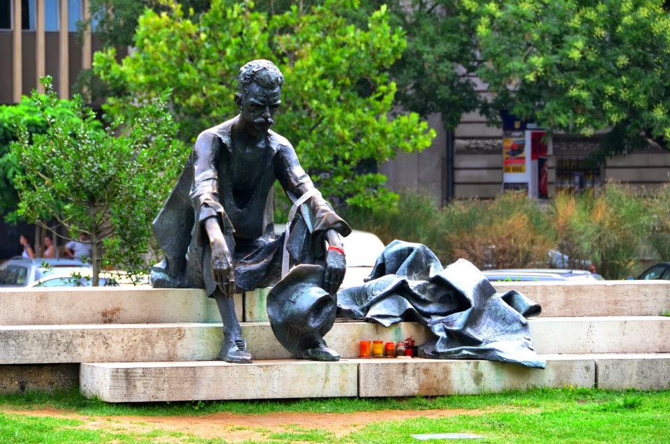銅像控的我又在拍有趣的銅像了。不過這位似乎有名氣,因為有人擺放蠟燭在他前面。