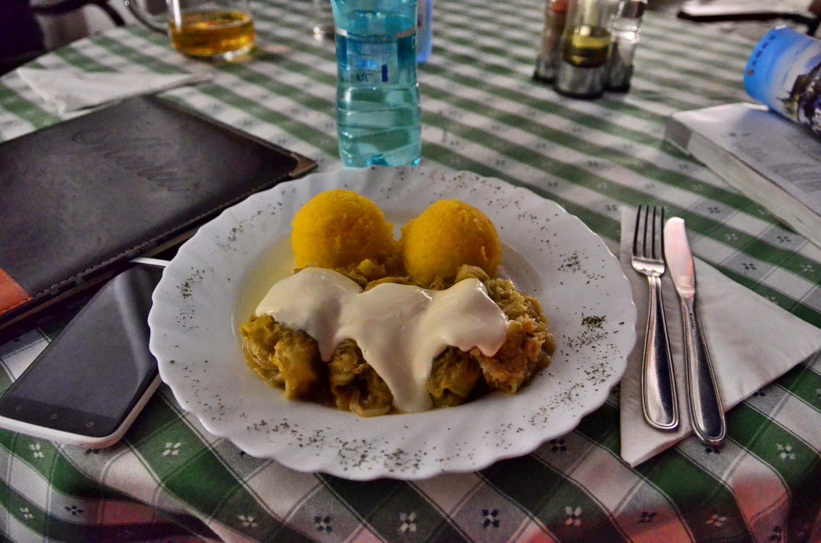 當地有名的食物,Sarmale加上玉米泥,其實它跟土耳其的Salma挺像的,也是用葉子包米和肉的混合,但做法稍微不同,土耳其是用悶的,羅馬尼亞的做法比較偏向用蒸的,而且用的是高麗菜葉,土耳其是用葡萄葉,但最特別的是上面還會淋上酸酸甜甜的酸奶,味道很獨特但卻非常合胃口。