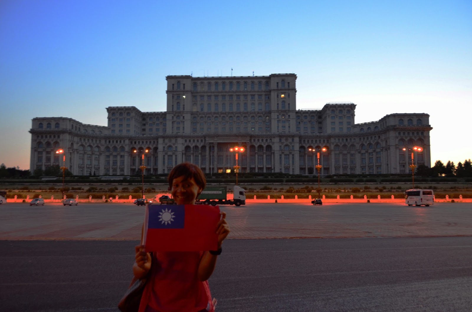 我們兩個參加玩步行團後,覺得沒以看到那棟斥資五百億台幣的國民之館,於是Uzo就去與司機談價錢(她會羅國語),講價成功,快速前往。果然名不虛傳,超雄偉壯觀的!台灣的總統府與之比起來真是小到不行。其規模之大,僅次於美國國防部的五角大廈,而這一切只為了滿足壽西斯古的私慾。