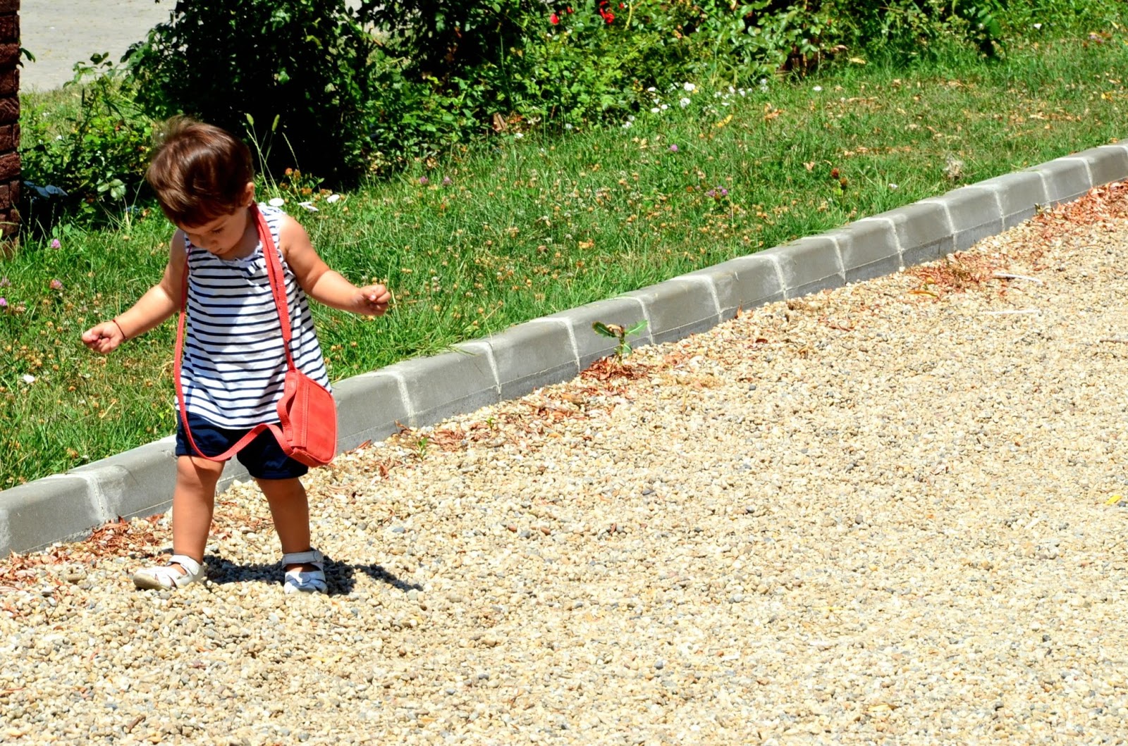 小北鼻在石子路上踏踏,爸爸在後面就這樣用慈祥的臉看著她。