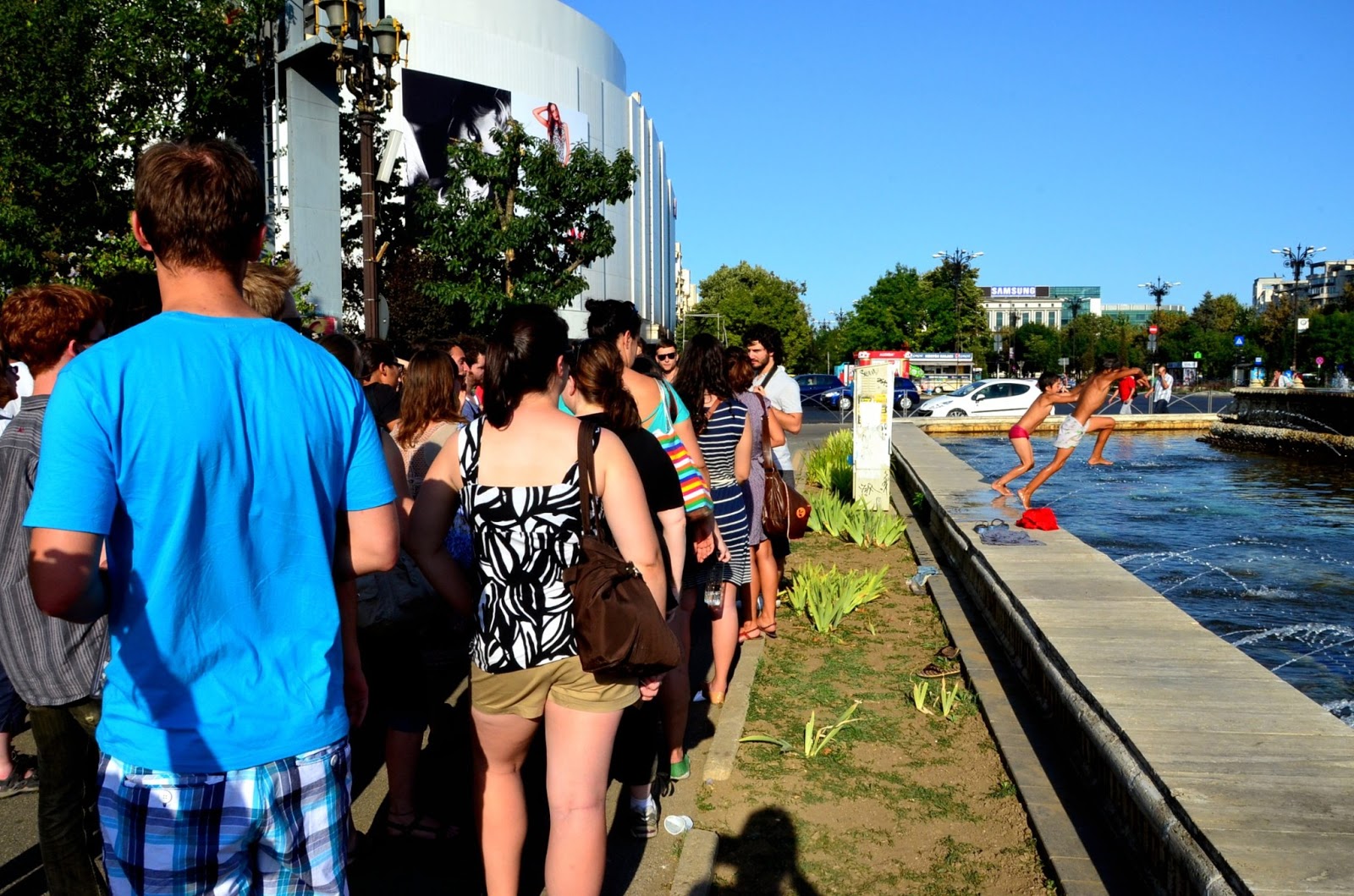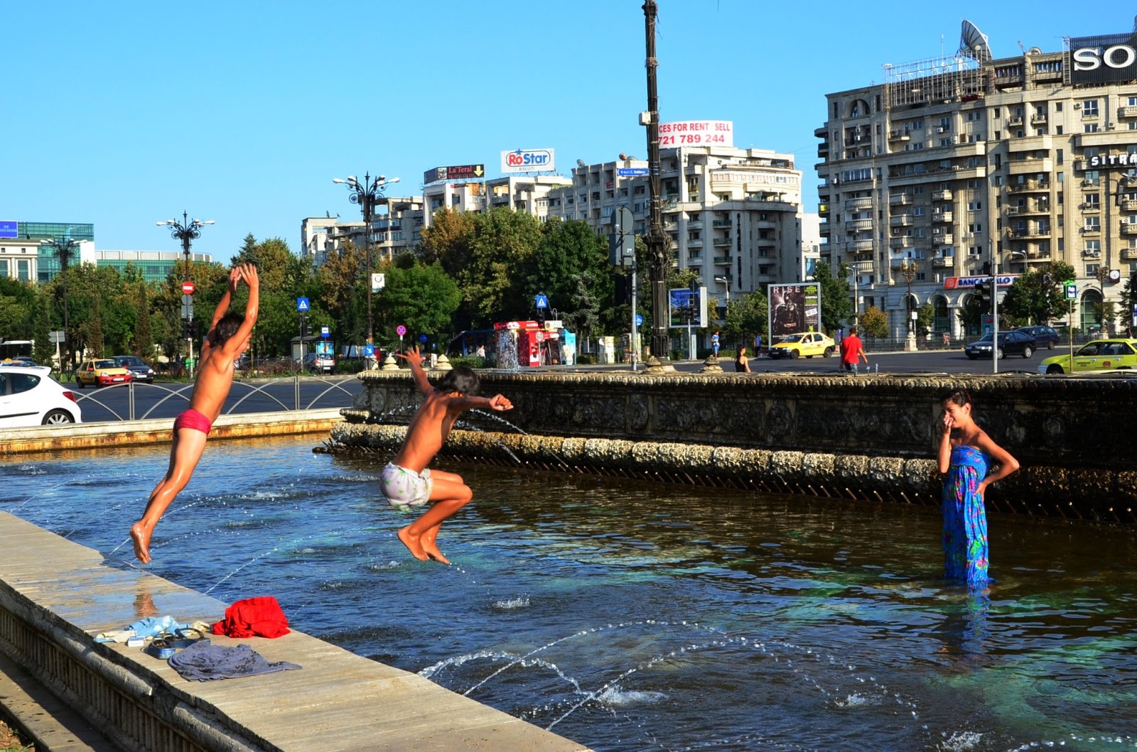 吉普賽小孩在市中心的水池裡玩水。