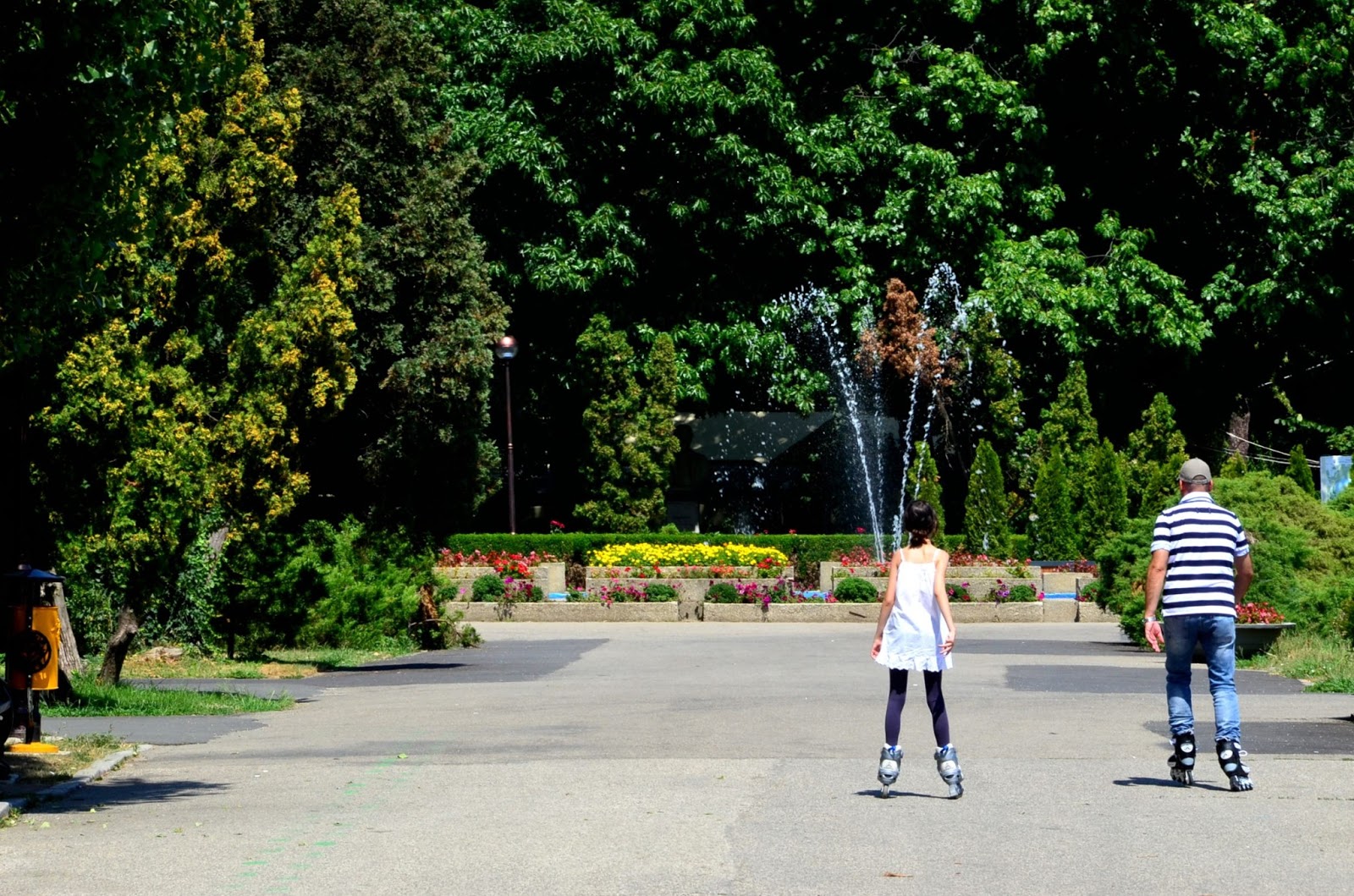 父女在公園裡溜直排輪。