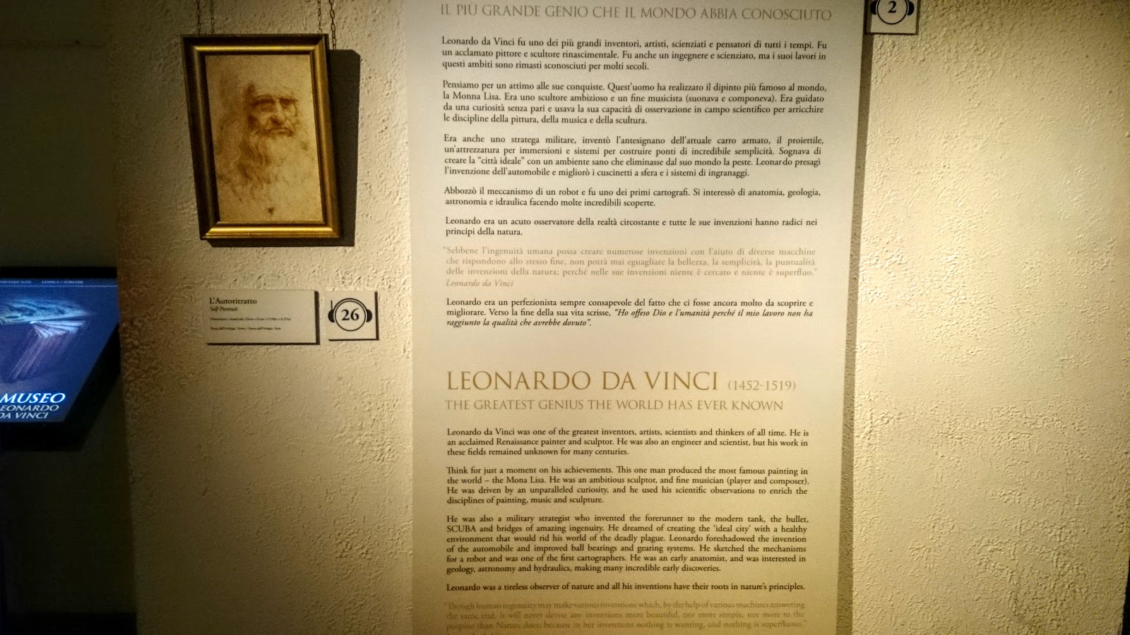 達文西博物館是我誤打誤撞找到的,我在看地圖時,根本沒有看到有,所以就走我自己想走的路,沒想到走到人民廣場後,就在北邊人民聖母教堂旁有著小小的達文西博物館。裡面展示著達文西曾經發明的物品樣式,以及介紹他的生平及著作與畫,如果對歷史與藝術有興趣的不妨可以進去看看。