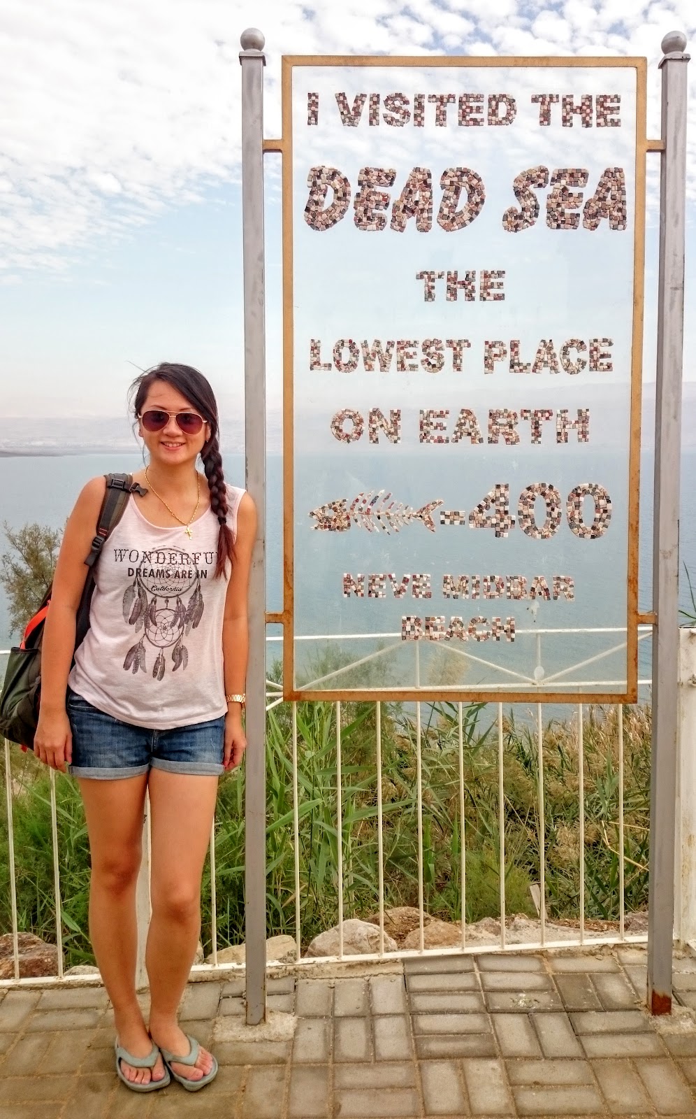 看板上寫著世界最低的海,海拔負400公尺。帶著興奮的心情,快速換衣服(也就是圖中的短褲短袖),衝去漂浮囉!