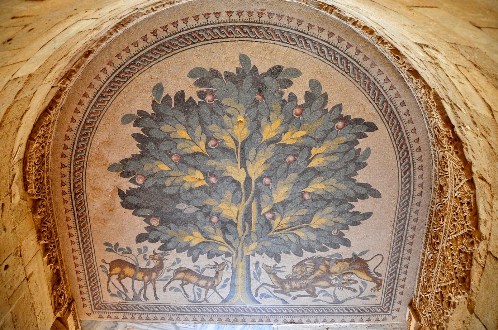 以前就有看過這幅馬賽克,名叫“Tree of Life”也是這座皇宮遺跡裡發掘出來的馬賽克中唯一有活的生物在裡面。樹的左邊有兩尊鹿,象徵著生命蓬勃,右邊則是一隻獅子把鹿咬死,象徵著死亡。
