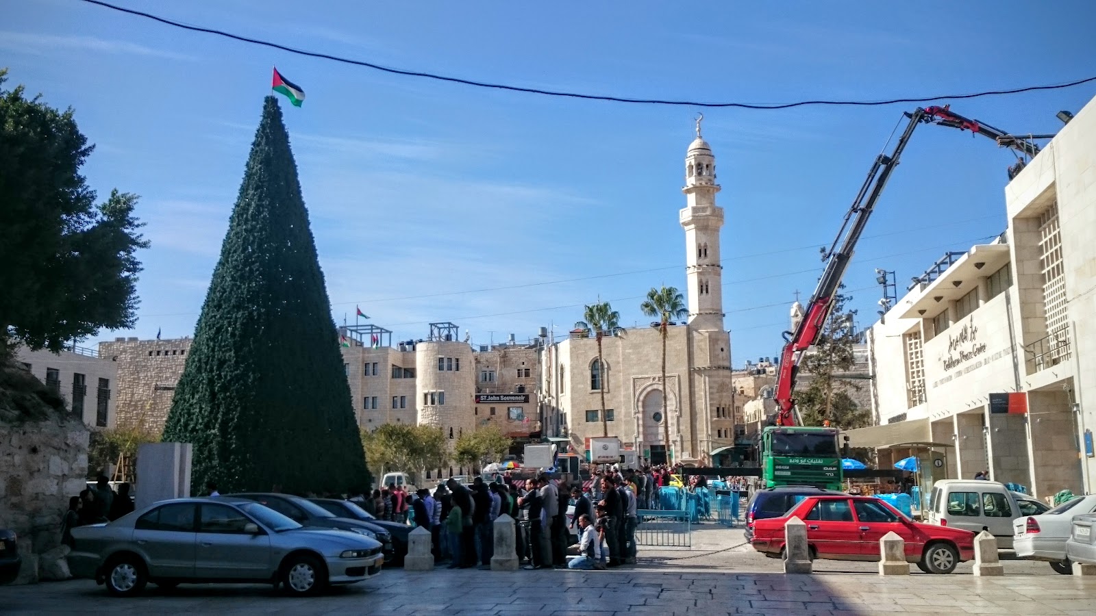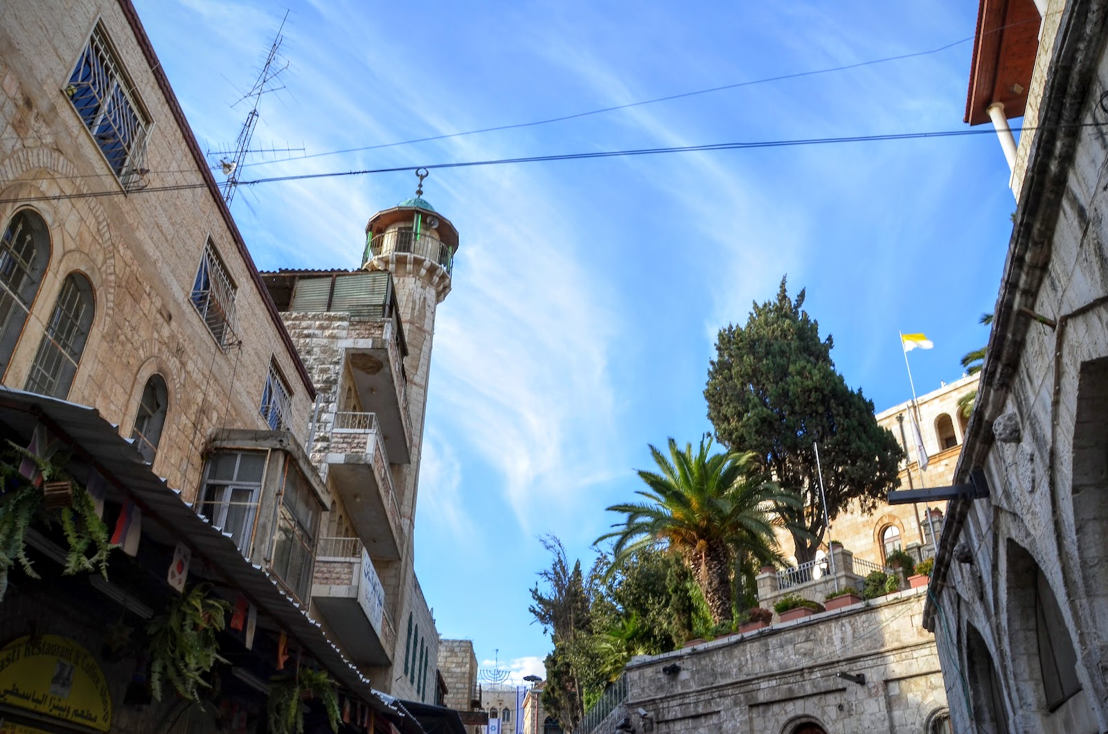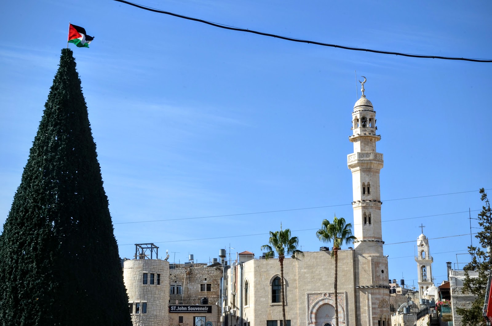 適逢星期五,穆斯林的週五禮拜。很喜歡這裡的宗教融合,雖然宗教不一樣但都互相尊重。聖誕樹上的巴勒斯坦旗子、一旁清真寺與教堂輝映在一起。