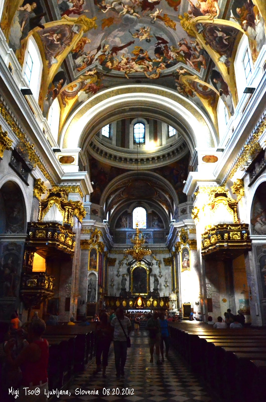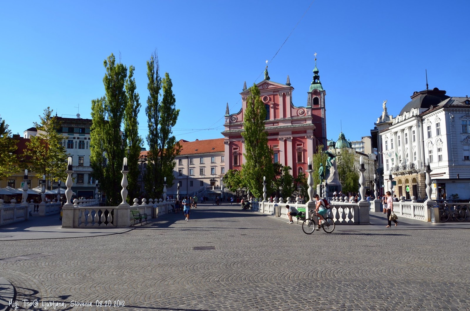 過了橋後馬上就可以看到的紅色建築是聖方濟教堂,這座興建於15世紀中的宏偉教堂,深受義大利的影響,禮拜天早上,盧比安納得市民都會來這教堂做禮拜。