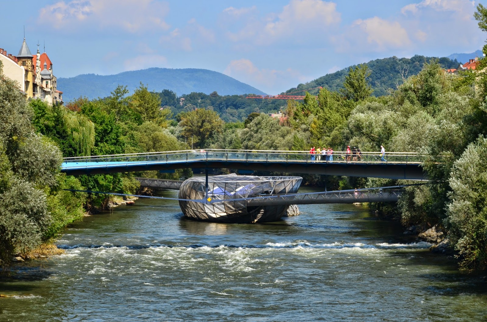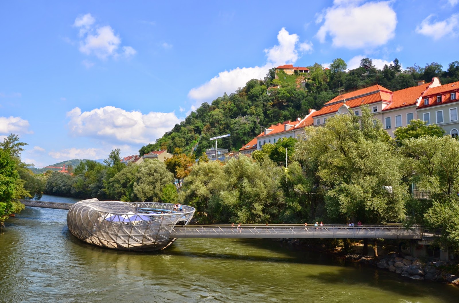 河流中有一個很特別的建築(?)這其實是"穆爾島",裡面是個咖啡廳,我有下去一探究竟,發現是貴桑桑的咖啡廳,所以只有拍一拍便走人,沒有坐下來喝一杯(等有情人再說)。