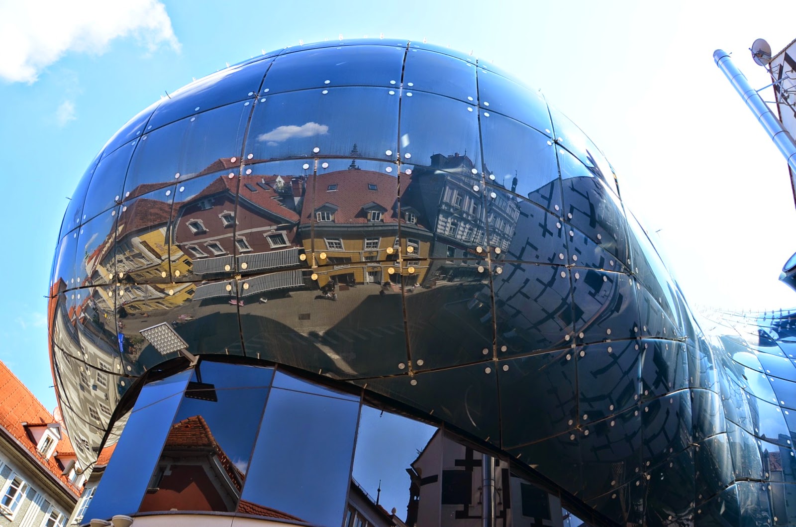 接著,到了河的對岸,我走到了格拉茲美術館,這個奇怪形狀的建築物,沒錯,就是美術館,既然跟藝術有關,建築也必須要有"藝術"。