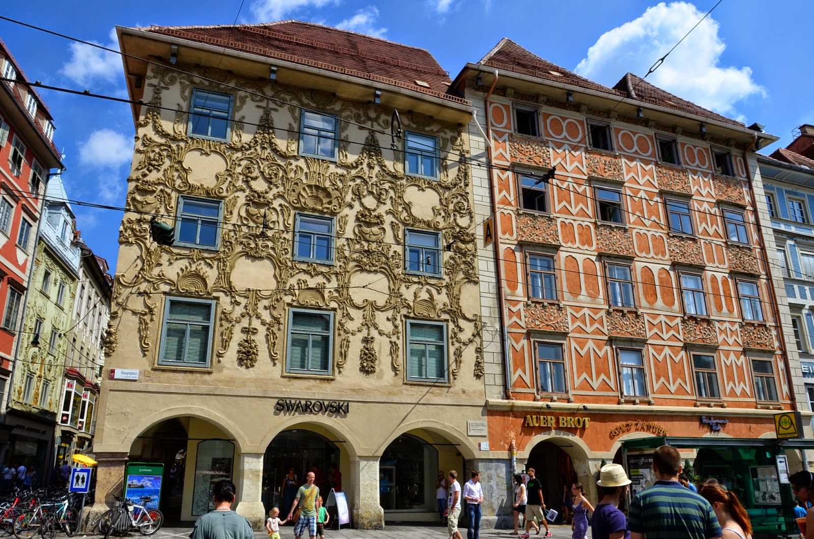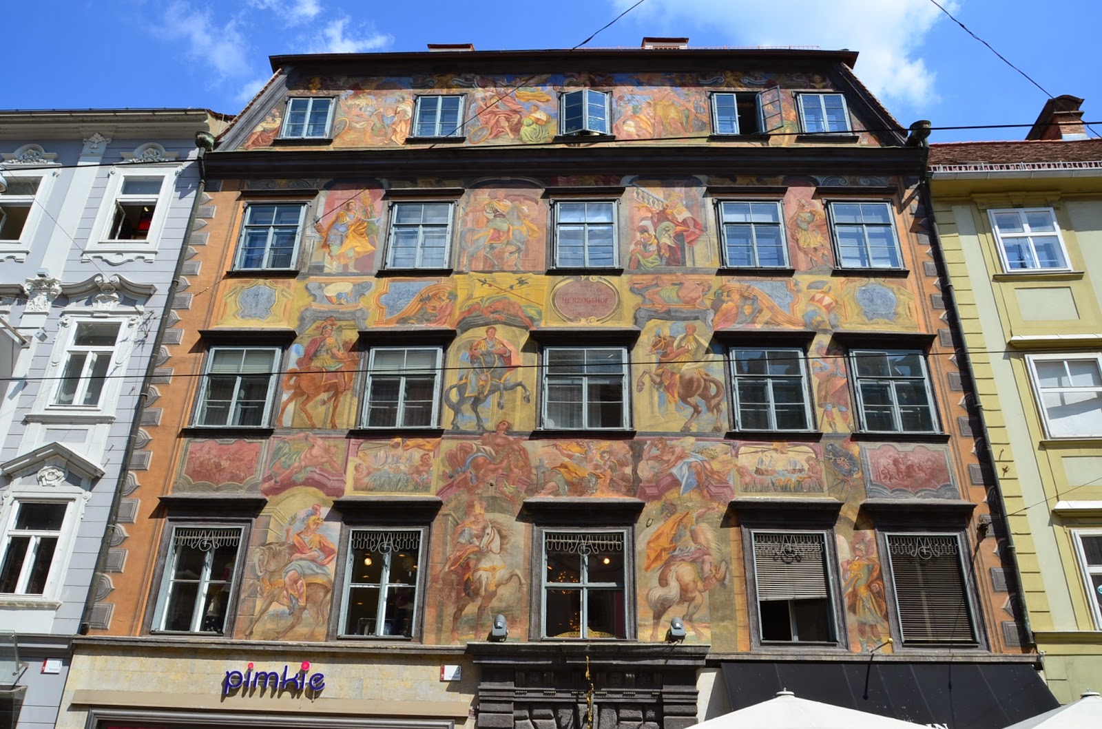 這個被刺青的房子就位在Herrengasse街上,最早紀載是在15世紀初開始被上色,直到1742年巴洛克畫家Johann Mayer以神話為主軸在牆上畫上了這幅壁畫。