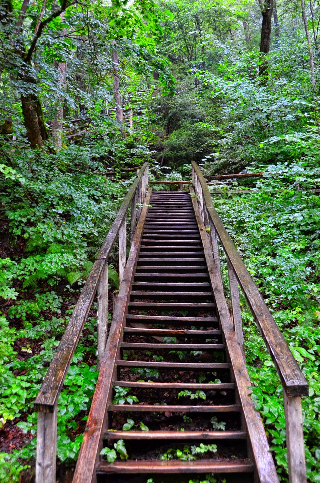 山洞旁還有這木造的階梯供你往上爬,我們走了一小段,享受一下芬多精,但因為雨太大,加上很滑,所以我們只有爬不到一半就下來了,日本媽媽沒有上來。