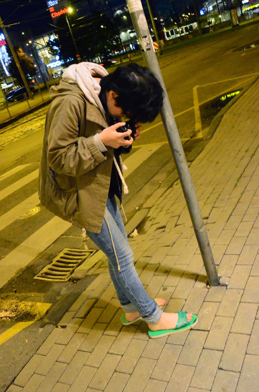 河童小姐穿著台灣土牌的綠拖鞋就這樣行走在大街上,哈!