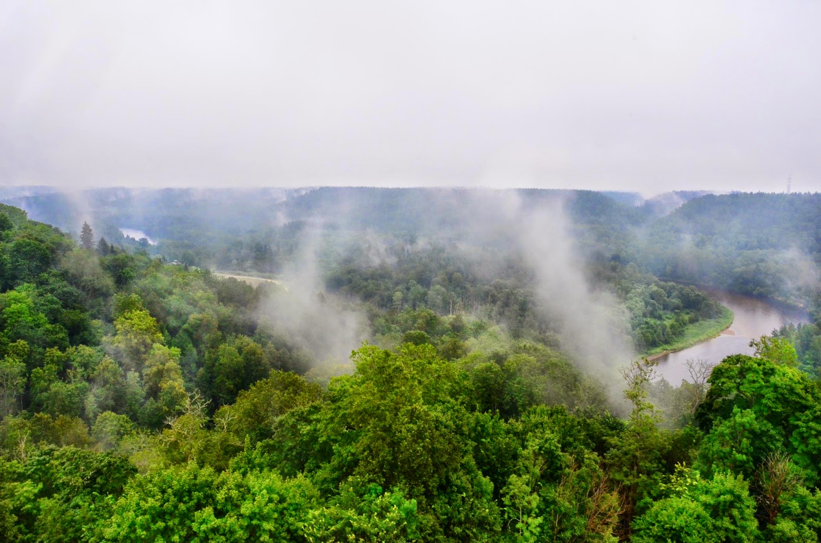 錫古爾達位在高亞國家森林公園的中央,因交通便達,所以很受拉脫維亞人跟遊客的歡迎。搭巴士不到一個小時就到,我們早上10:20就坐上巴士出發去錫古爾達,約11點就到了(1.5Ls),沿路風景美不勝收,都捨不得瞇眼,深怕錯過任何一個美景,可惜天公不作美,當天下起傾盆大雨,我們有攜帶雨傘,但美美的藍天就看不到。