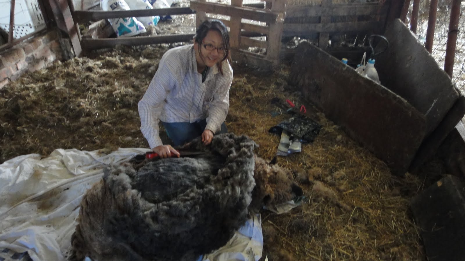 去教授的農場幫羊咩咩手工剃羊毛,沾得滿身的羊便便,但我玩得不亦樂乎。